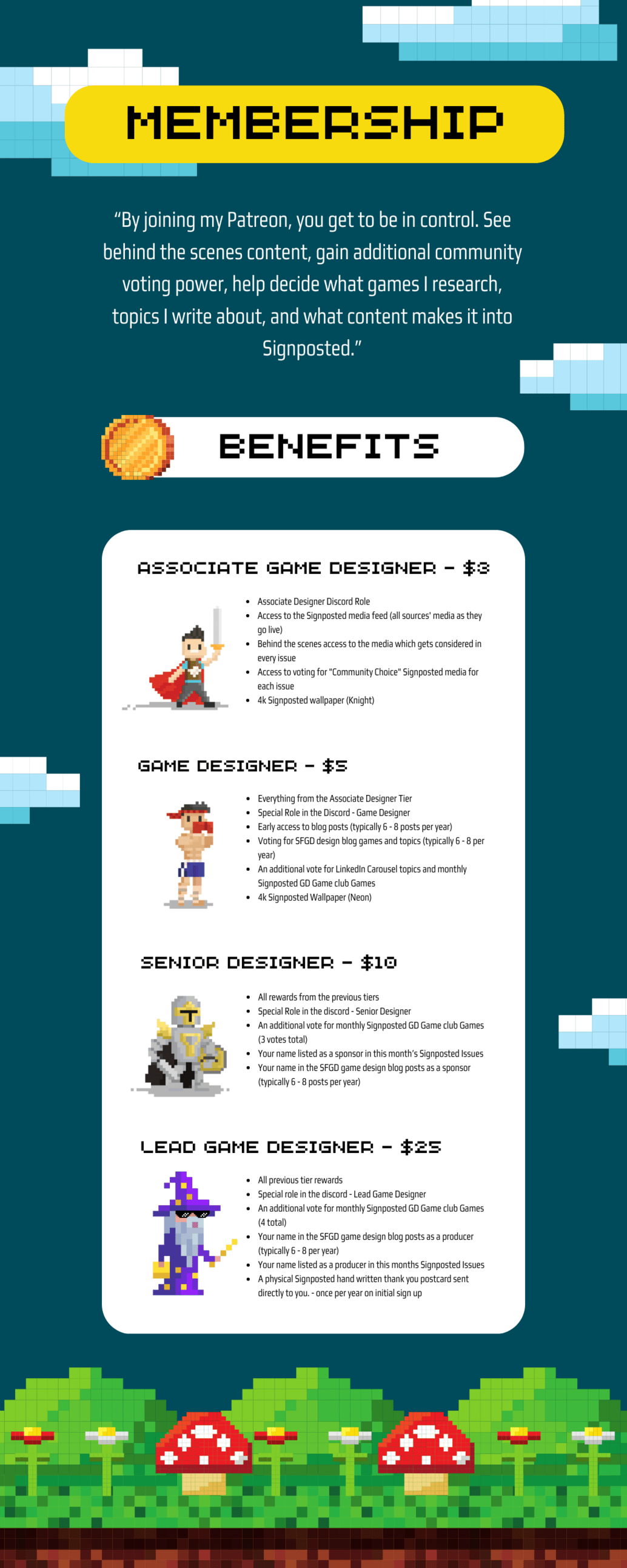 By joining the Signposted Patreon, you get to be in control. See behind the scenes content, gain additional community voting power, help decide what games I research, topics I write about, and what content makes it into Signposted.